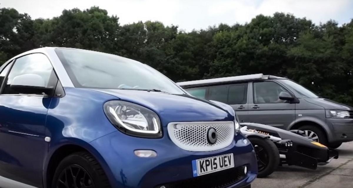 Sur la ligne de départ à l’accélérateur on retrouve ainsi une Smart Fortwo (même pas une Brabus), une Ariel Atom 3.5R et un Volkswagen California. Quand on affiche le pedigree d’un engin radical à 350 ch et 330 Nm pour 555 kg et qu’on atomise le 0 à 96 km/h en 2,5 s, forcément ça aide…