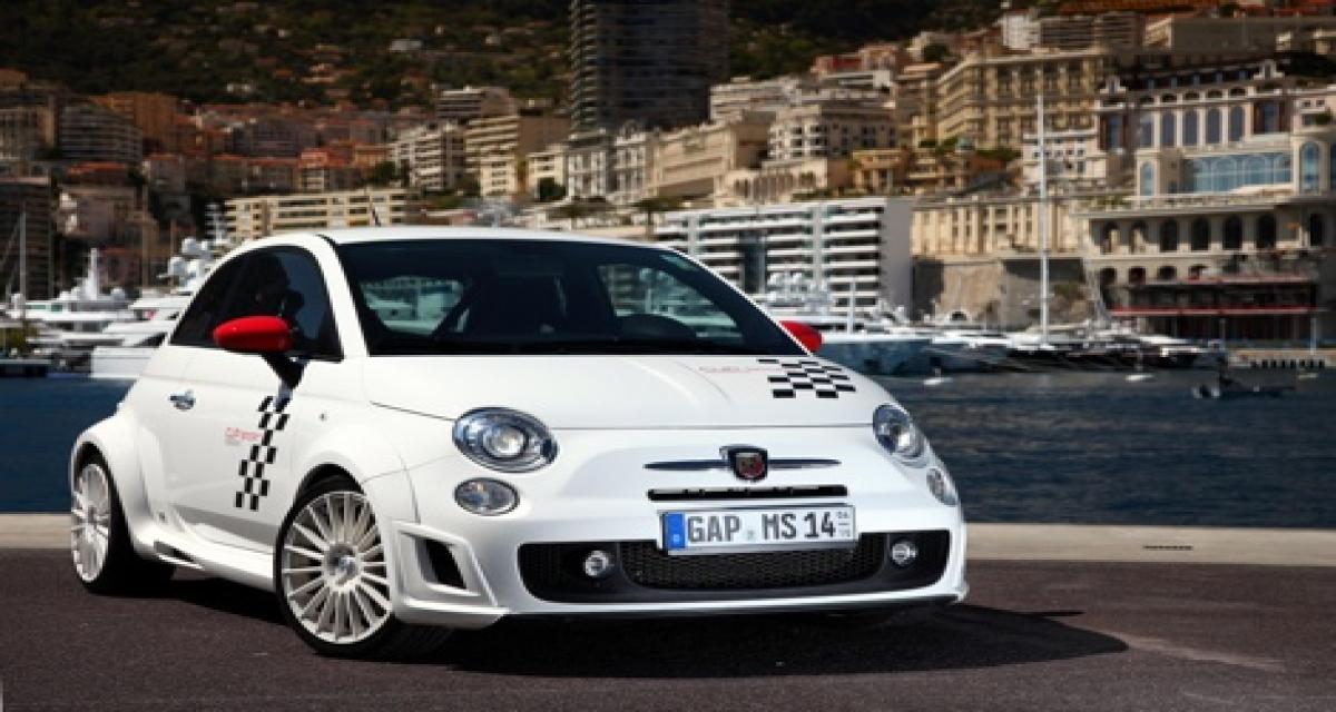 Dans l’enceinte du Grimaldi Forum, nous retrouvions ainsi une Fiat 500 élargie à souhait comme en 2007. Sauf qu’il s’agit ici d’une version Abarth Cabriolet. La Cup Exclusiv se distingue donc par une présentation plus sportive avec des appendices aérodynamiques et surtout, des ailes élargies de 6cm. L’ensemble de la caisse s’abaisse pour venir se poser sur des jantes blanches de 17 pouces.