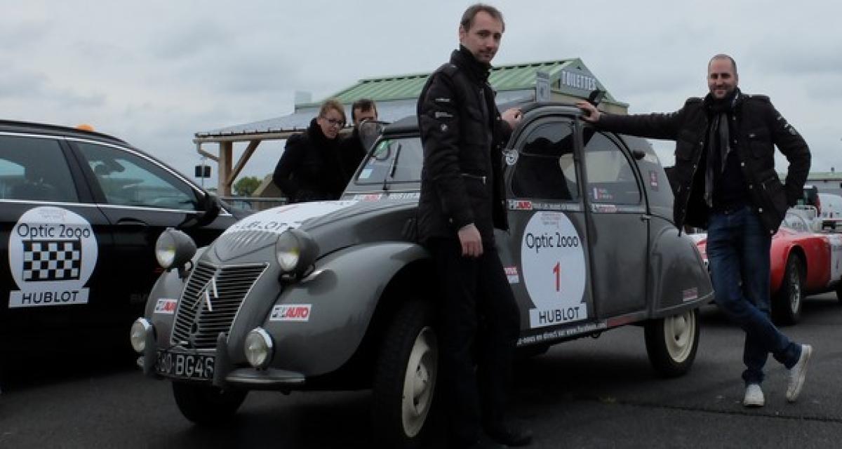 Il faut dire qu’à l’applaudimètre, le passage de la voiture n°1 vaut tous les V12 et les roadsters affûtés. Et malgré un furieux appétit pour les cardans, ou l’apparition d’une myriade de bruits aussi nouveaux qu’indéfinis –et parfois même inquiétants-, la 2cv a rallié La Rochelle sans encombre. A son aise dans les liaisons, aidée par un parcours sur des départementales souvent figées dans le temps, la 2cv s’effondre une fois le chronomètre sorti. Le bicylindre ahane alors à perdre haleine dans les spéciales, la frêle carapace se faisant souffler par les side pipes vociférants de la Cobra Daytona sur circuit. Pas quoi faire perdre à Thomas son flegme et à Hugo sa bonne humeur. Et faire le Tour en décalé est aussi une excellente façon d’y participer !