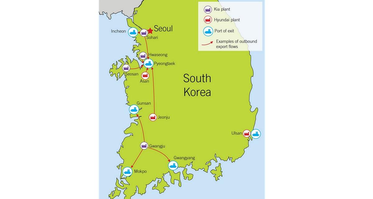 Hyundai Motor possède sept usines en Corée du Sud, dont cinq sont situées à Ulsan …. au bord de l’eau …. les deux autres à Jeonju et Asan.