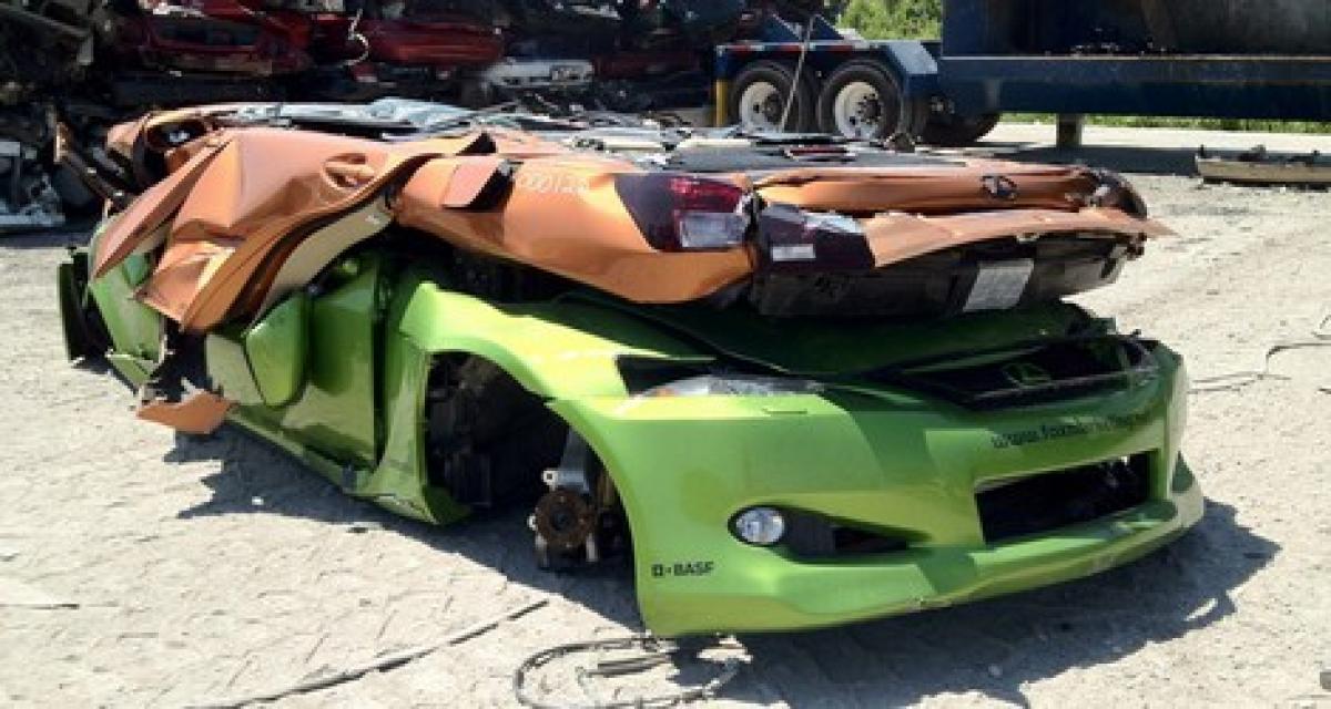 Cash for clunkers (équivalent américain de la prime à la casse) version tuning : non pas vraiment. En 2008 puis 2009, Lexus Marketing révélait notamment deux préparations dans les allées du SEMA Show, cette Lexus IS-F et cette Lexus IS350C. Les deux viennent de connaître une fin de vie (turbo)compressée…
