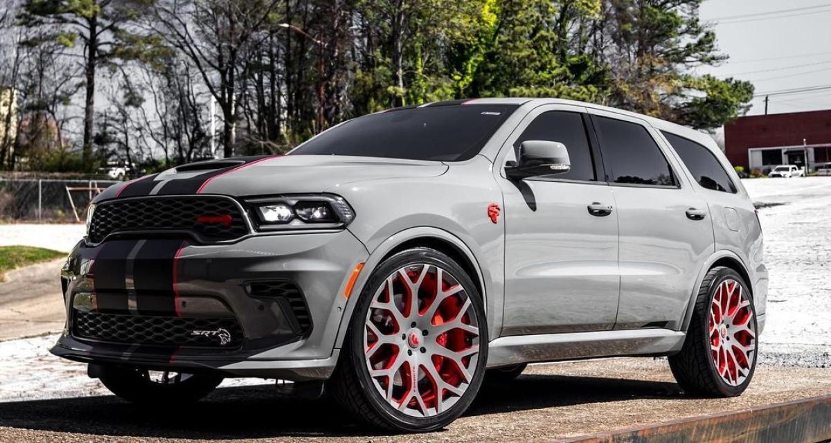 En plus de l'augmentation de la puissance, ce Durango SRT Hellcat bénéficie d'autres améliorations esthétiques tape-à-l’œil et diaboliques. Par exemple, on peut voir des étriers de frein rouge brillant, des doubles bandes de course noires et rouges courant sur toute sa longueur, une carrosserie Gris Nardo (oui ma gâtée, si vous avez la ref), un film de protection de peinture, des feux extérieurs fumés et des vitres teintées d'intimité. De plus, l'ensemble de la carrosserie a été abaissé de 30 mm grâce à l'installation de suspensions modifiées, tandis que de nouvelles roues en forme de Y de 24 pouces conçues par Forgiato se détachent latéralement.
