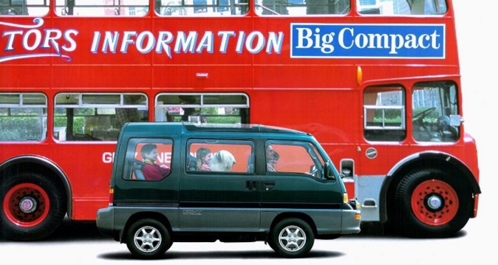 C’est fin 1994 que Subaru se décide à importer sous nos latitudes son petit monospace, répondant initialement au doux nom de Sambar dans son pays d’origine. De par ses dimensions, il se destine notamment à la ville : 3,5 mètres de long, 1,4 mètre de large et 1,92 mètre de hauteur. Parfait pour un déménagement, mais aussi pour transporter 6 personnes, aussi incongru que cela puisse paraître…