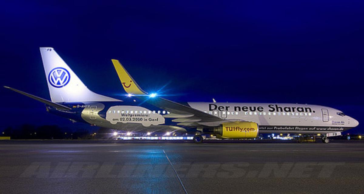 Volkswagen a en effet redécoré un avion de la compagnie allemande TUIfly (Jetair) à ses couleurs. La queue de l’avion porte donc désormais le logo du constructeur allemand tandis que les flancs reçoivent la mention «Le nouveau Sharan», avec un invitation à venir le découvrir dès le 02 mars prochain en première mondiale.