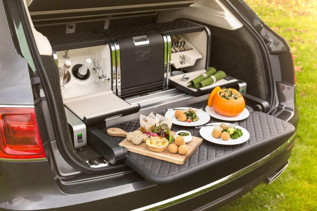 Un Bentayga s’est fait une place. Le SUV n’était pas arrivé le coffre vide puisqu’il accueillait son ensemble à pique-nique, un accessoire affiché à quelques 25 000 euros au catalogue des options.
