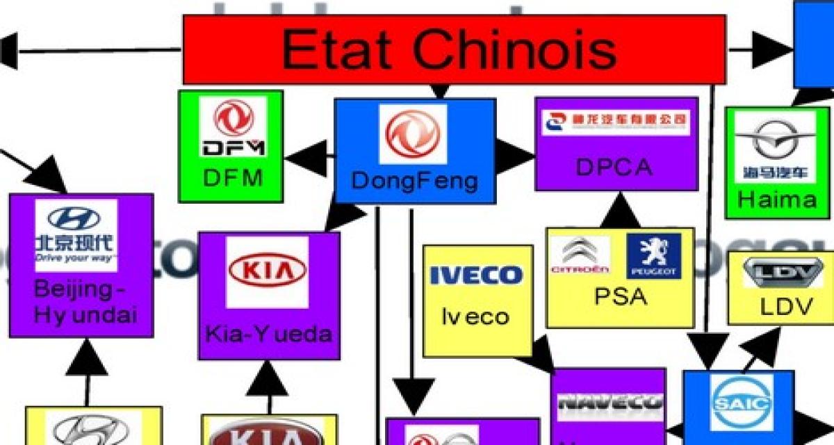 Les flèches doivent se lire « possède… » Par exemple: « DongFeng possède DongFeng-Honda avec Honda. »
