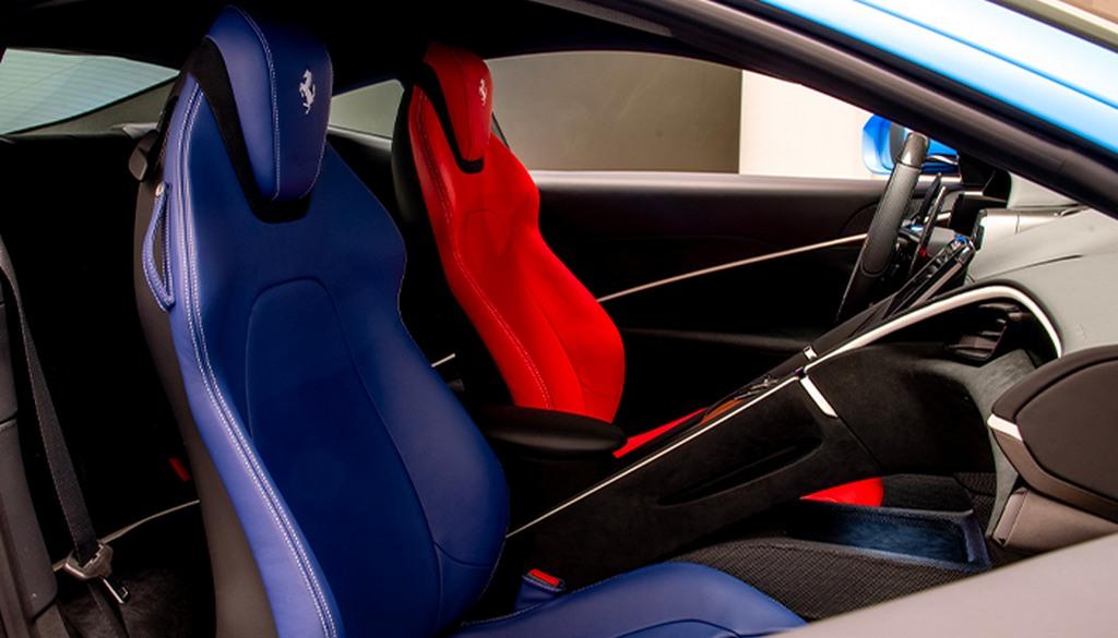 L'habitacle dévoile un choix de couleurs particulier : le siège conducteur, habillé de cuir fin Frau Crimisi, contraste vivement avec le Frau Notte Blu du siège passager, tous deux agrémentés d'un passepoil blanc. Au centre, l'attention est captée par un insert en bois raffiné qui entoure le sélecteur de transmission tandis que la boîte à gants apparaît recouverte de tissu.