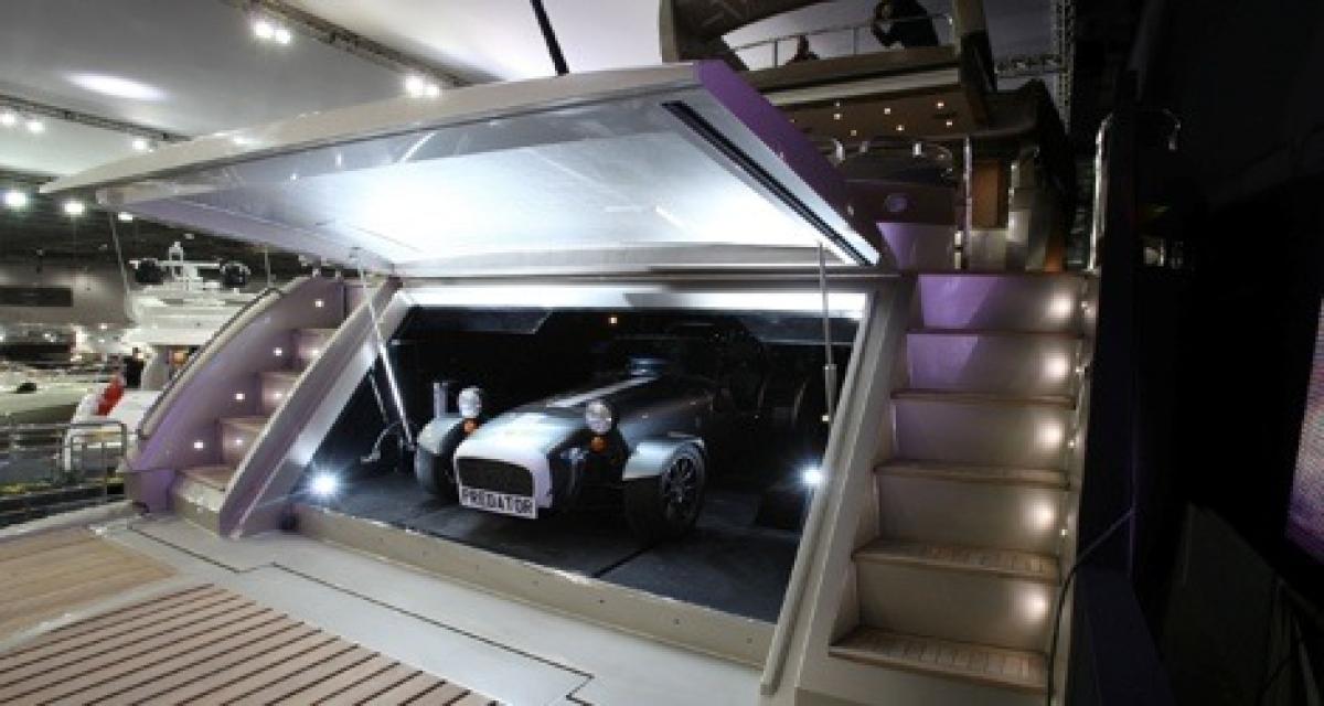 Le Sunseeker Predator 108, puisque c’est de lui qu’il s’agit, peut accueillir 8 occupants mais son vrai but, c’est la performance. Un yacht de sport, quoi, et Sunseeker a songé que la meilleure façon de le souligner était de remplir le garage, qui accueille traditionnellement un petit canot, avec une Caterham Seven à l’occasion du London Boat Show. Ansar Ali, le directeur de Caterham, a fait de son mieux pour tenter de trouver un rapport entre les deux machines et s’en sort avec « Nos deux entreprises ont plus en commun qu’on pourrait penser de premier abord, malgré la différence de taille entre les véhicules. Il est fort possible que Colin Chapman lui-même eût félicité Sunseeker pour son approche minimaliste et tournée vers la performance pour la série Predator, et les propriétaires de Sunseeker profiteraient sûrement de la chance de pouvoir revivre sur la route le même type de sensations éprouvées dans les vagues ». Admettons. Au final, nous gagnons une série d’images sympathiques où une Caterham pointe le nez dans un yacht spectaculaire. On n’en demande pas plus…