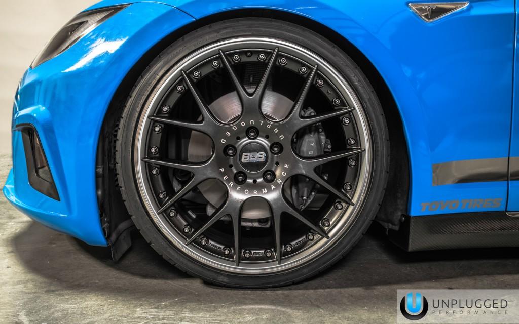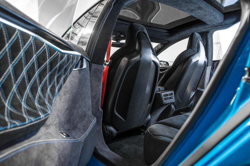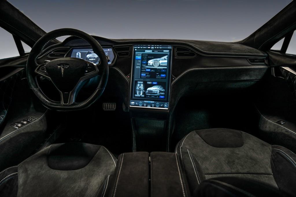 La calandre perd son coté laqué pour ne garder que la coté fibre de carbone. Elle perd aussi ses arrondis et mène vers un bas de bouclier qui rappelle ceux de certaines Jaguar. Le bouclier a bien entendu été développé pour reprendre les attaches d’origine de la Tesla S mais aussi les détecteurs du radar avant et les feux avant (qui peuvent aussi être personnalisés).