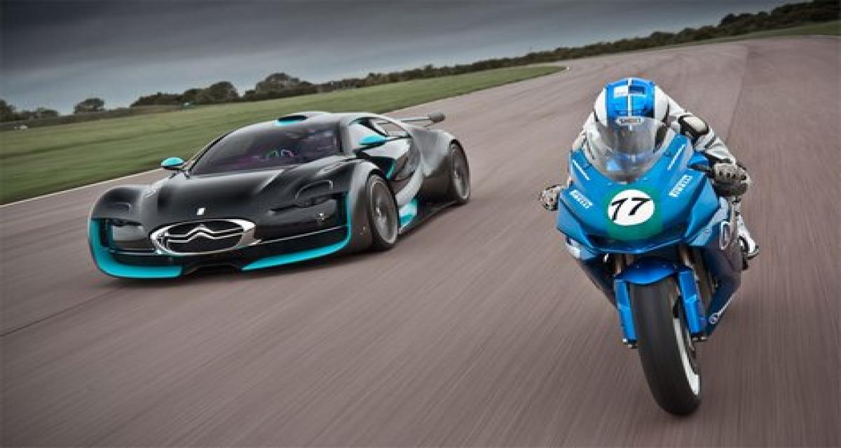 Sur le circuit de course Thruxton outre-manche, Citroën organisait récemment un duel sympathique entre le concept Survolt et la moto électrique Agni Z2 (superbike) à l’occasion de la participation du concept à la manifestation EcoCar Spectacular. Quant aux pilotes on retrouvait Vanina Ickx pour les Chevrons contre Jenny Tinmouth sur deux roues.