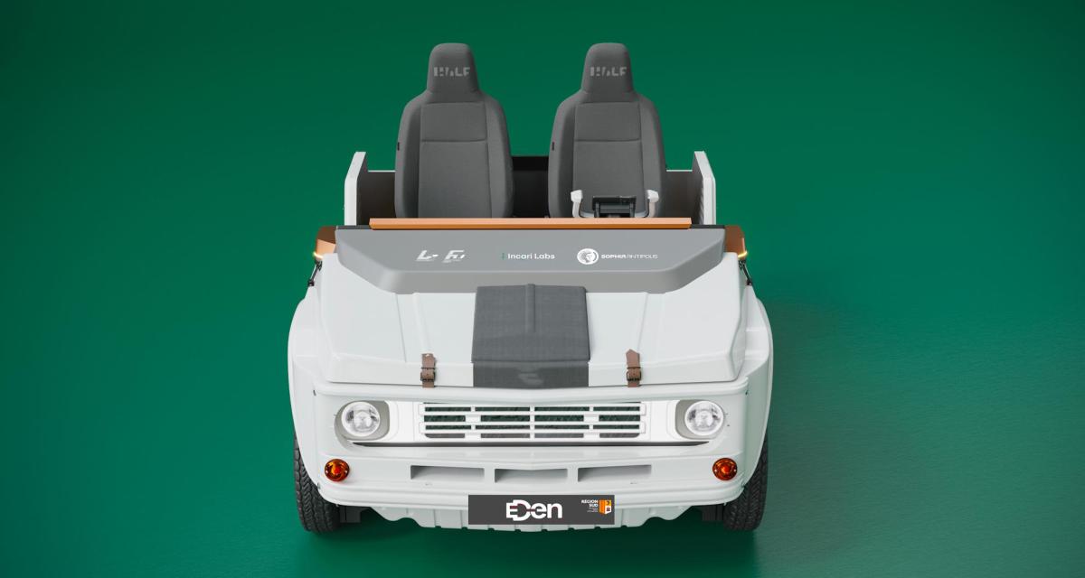 Des écrans, il y en a dans ce HALF puisqu'on compte un smartphone au centre du volant, un grand écran tactile vertical, mais aussi une immense dalle à la base du "pare brise". Ce démonstrateur ressemble à une Mehari car L2concept a fait appel au Mehari Club Cassis pour intégrer des éléments de carrosserie de l'EDEN, réinterprétation moderne du véhicule Citroën.