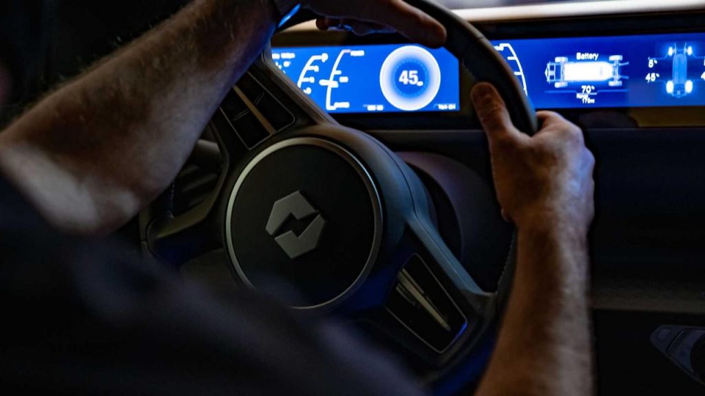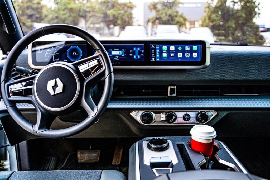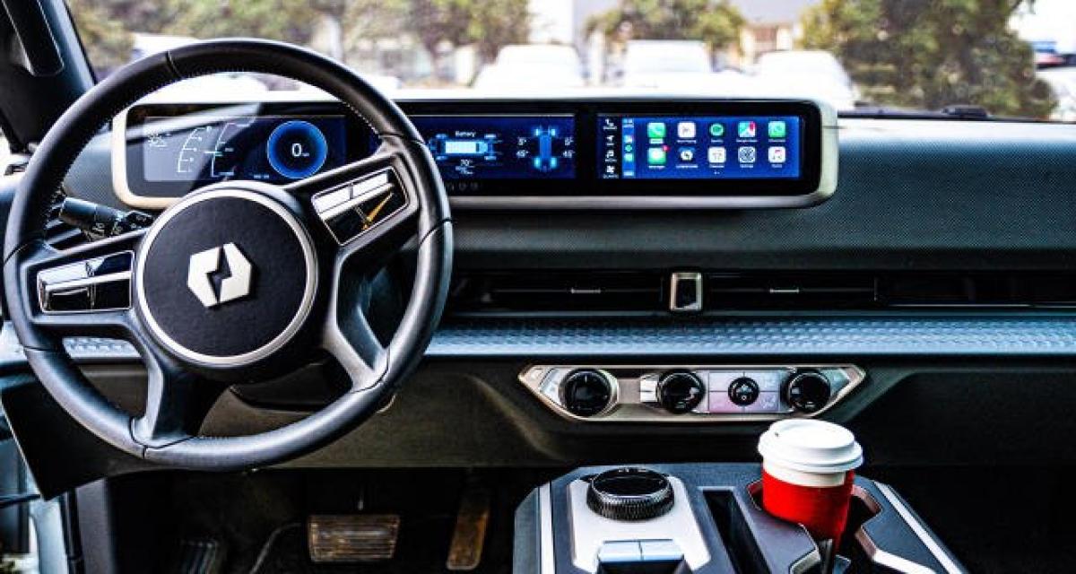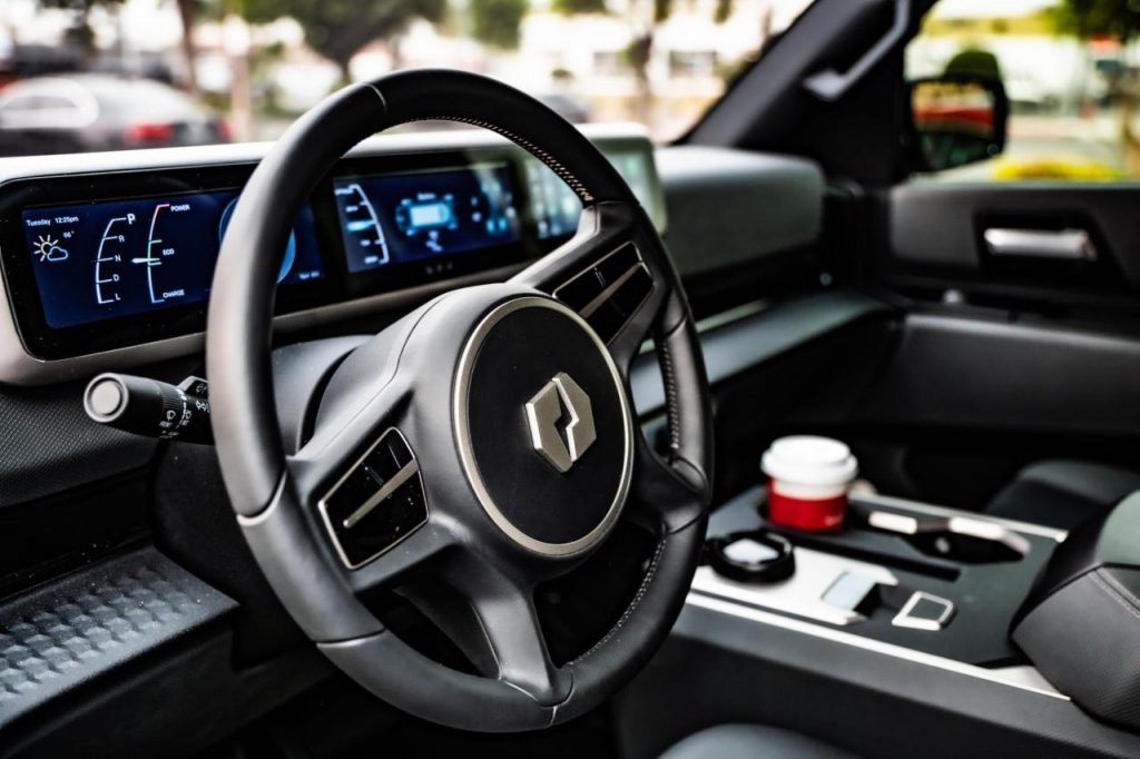 Jusqu’à présent, nous avions vu l’intérieur via des dessins présentés par Lordstown. Ici, on le voit « en vrai » et on peut apprécier un peu plus l’aspect et la qualité visuelle. Ce qui saute aux yeux, c’est qu’on échappe à une immense tablette centrale. Ouf ! Mais, on n’échappe quand même pas à des instruments et de l’info-divertissement affichés via trois écrans cote à cote.