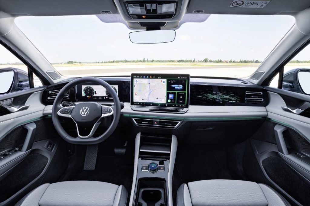 Le Tiguan conserve une palette de motorisations large comprenant des TDI 150/190 CV, des TSI, de l’hybridation légère (eTSI) et hybrides rechargeables (eHybrid), associés désormais exclusivement avec la boîte robotisée DSG. Tout comme sur les modèles Volkswagen ID. et la nouvelle Passat, le changement de vitesse s’effectue désormais à l’aide d’un levier de commande (commodo) au fonctionnement auto-intuitif, situé à droite du volant. Il suffit en effet de pousser le sélecteur sur « D » (« drive ») pour avancer, de le tirer sur « R » (« reverse ») pour reculer et de presser le bouton sur le côté du levier pour actionner le frein de stationnement. Tous les modèles Tiguan sont en outre dotés de palettes de changement de vitesse au volant.