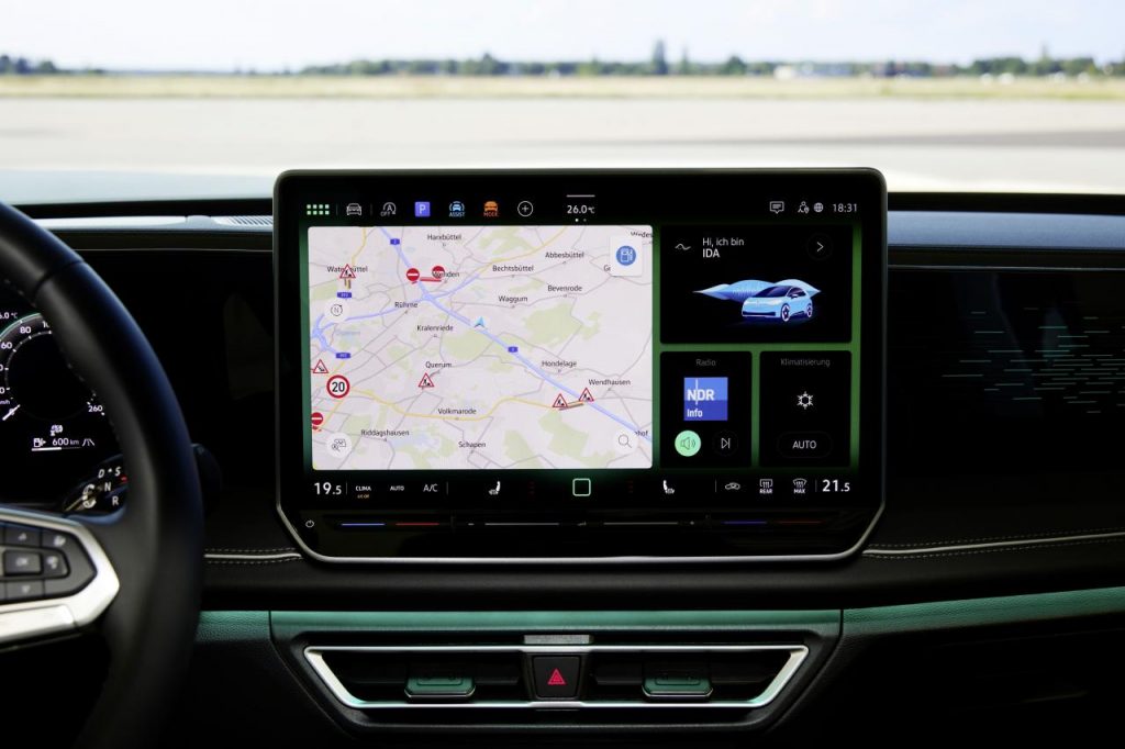 Nouvelle plateforme dit aussi mise à jour logicielle. L’habitacle présente un nouvel agencement, toujours avec des lignes assez tendues et carrées, mais une interface entièrement numérique MIB de 4ème génération. En plein cœur d’un tableau de bord assez enveloppant, trône au format panoramique avec un revêtement antireflet, un écran de 15 pouces (pour les finitions les plus élevées) pour le système d’infodivertissement, mais aussi un nouveau système d’affichage tête-haute et un nouveau sélecteur de mode de conduite multifonction avec écran OLED intégré, qui prend la place du levier de vitesses classique. Ce nouveau bouton rotatif, doté de son propre écran miniature, sert à choisir le profil de conduite, à contrôler le volume de la radio ou encore à sélectionner la teinte de l’éclairage d’ambiance. Là où d’autres marques, comme Skoda, remettent en scelle les boutons physiques, VW accentue la digitalisation. Par ailleurs, un grand nombre de fonctions de commande du véhicule ou du système d’infodivertissement peuvent être commandées à la voix grâce au nouvel assistant vocal IDA.