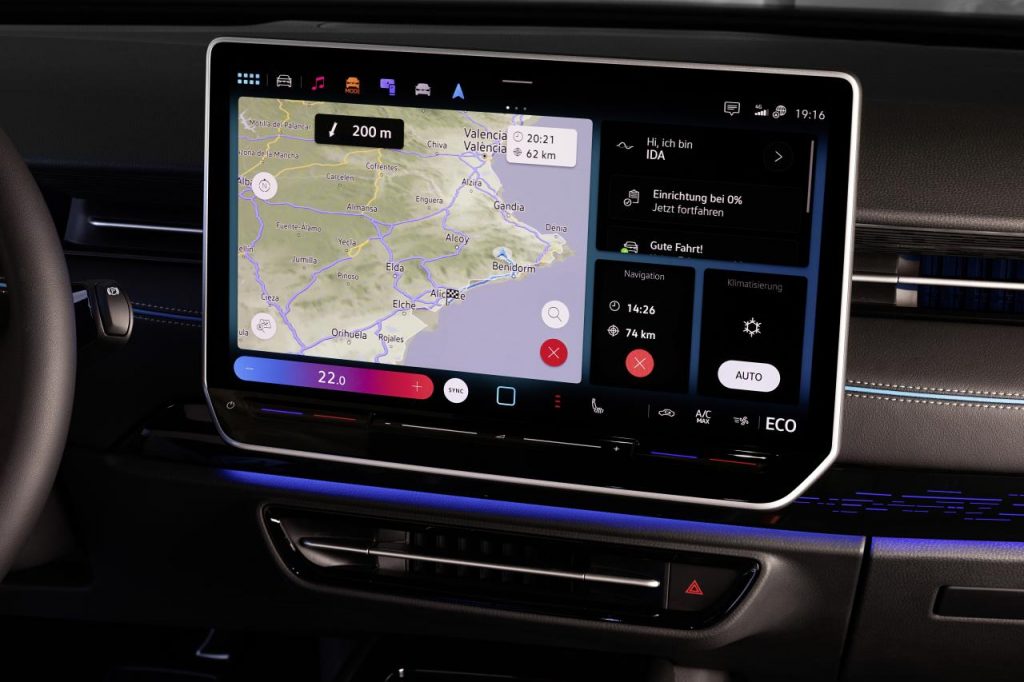 La pièce maîtresse de l'intérieur est un système d'infodivertissement autonome de 15 pouces, qui contrôle presque tout, rappellant ainsi l’ambiance d’une Tesla. C'est tout nouveau et Volkswagen a déclaré que "l'interface graphique et la navigation dans les menus ont été largement restructurées". La société a poursuivi en disant que le système d'infodivertissement est plus intuitif, plus personnalisable et comporte deux "barres tactiles" ainsi qu'un bouton d'écran d'accueil. Il y a également des curseurs tactiles physiques sous l'écran ainsi qu'un assistant vocal, qui peut ajuster une grande variété de paramètres du véhicule et répondre aux questions sur la météo.