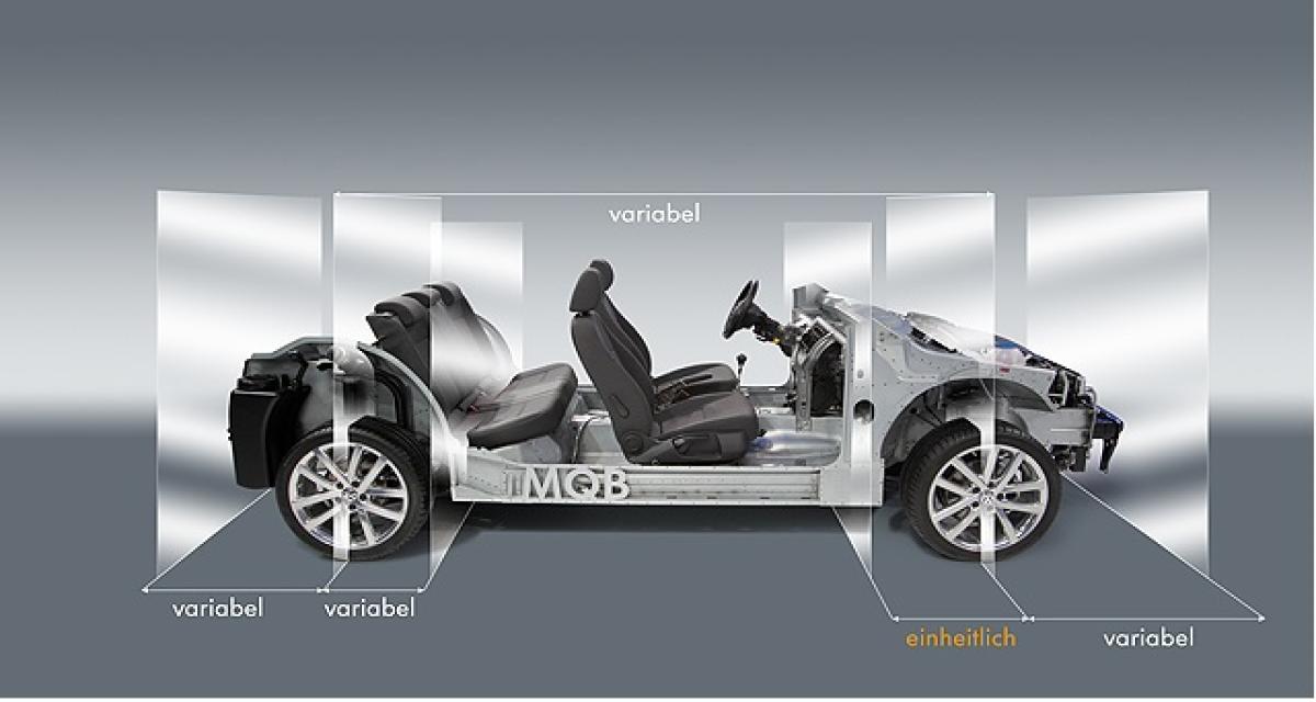 Avec ce plan, la plate-forme MQB va constituer la base technologique pour pratiquement tous les futurs véhicules du groupe munis d’un moteur transversal. Elle comporte sept composants standards différents : avant et arrière de la voiture plus essieu correspondant, plancher central ainsi que sièges avant et arrière. Certaines dimensions, telles que la distance entre la pédale d’accélérateur et le centre des roues avant, seront toujours identiques pour permettre une structure uniforme de l’avant de la voiture.