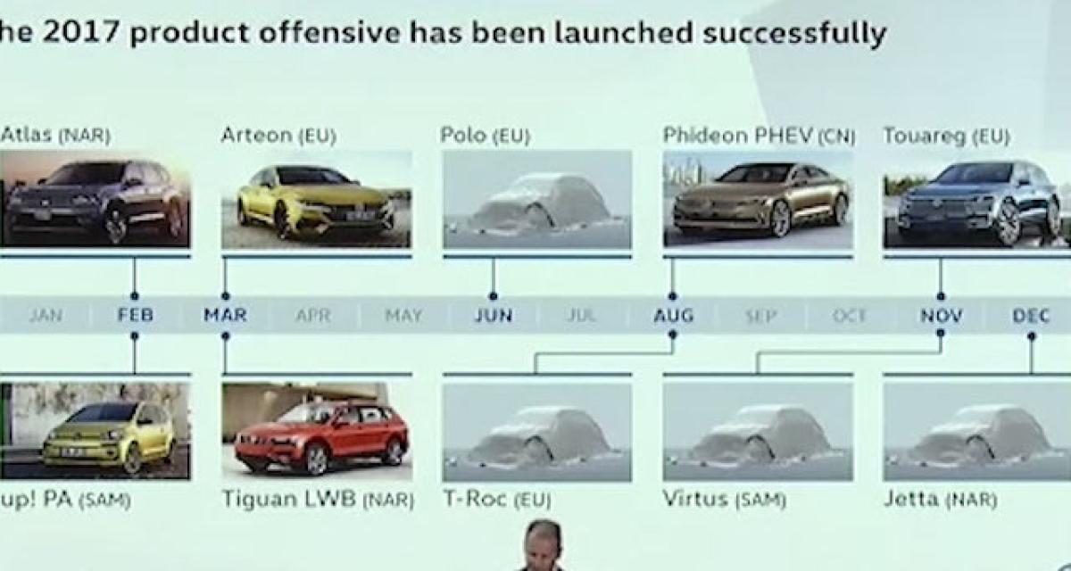 Sans surprise, la présentation de la prochaine Polo est programmée pour juin tandis que le T-Roc sera dévoilé en août prochain. Déjà connue, la grande berline Phideon GTE débarquera dans les concessions chinoises également au mois d’août. Quant à la Virtus, remplaçante de la Voyage en Amérique du Sud, elle sera officiellement présentée en novembre 2017. C’est également au mois de novembre que le Touareg devrait arriver dans les concessions avec une présentation en première mondiale au salon de Francfort en septembre.