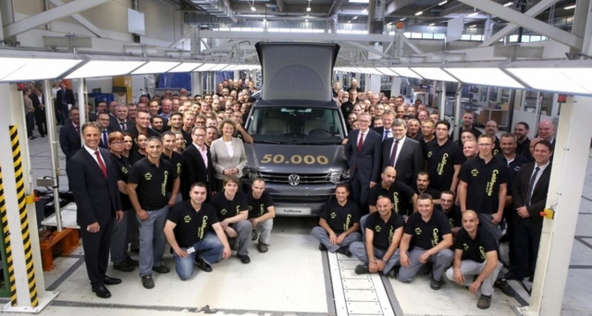 Photo de famille traditionnelle devant l’exemplaire en question. Volkswagen salue la production du 50 000e T5 California, une auto produite au sein du complexe industriel de Hanovre Limmer.