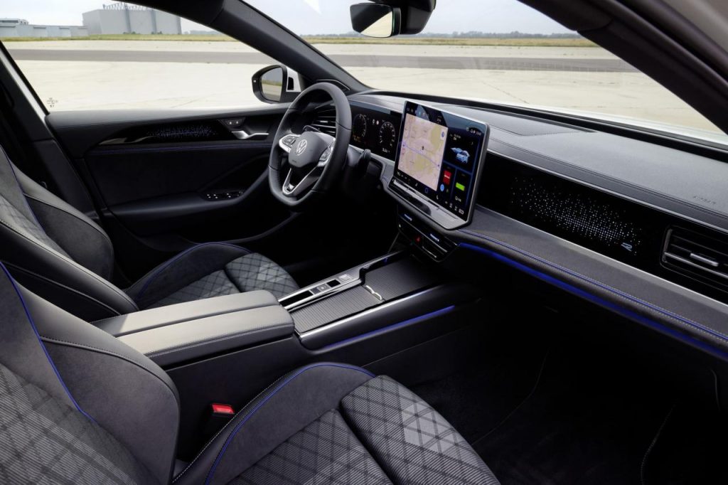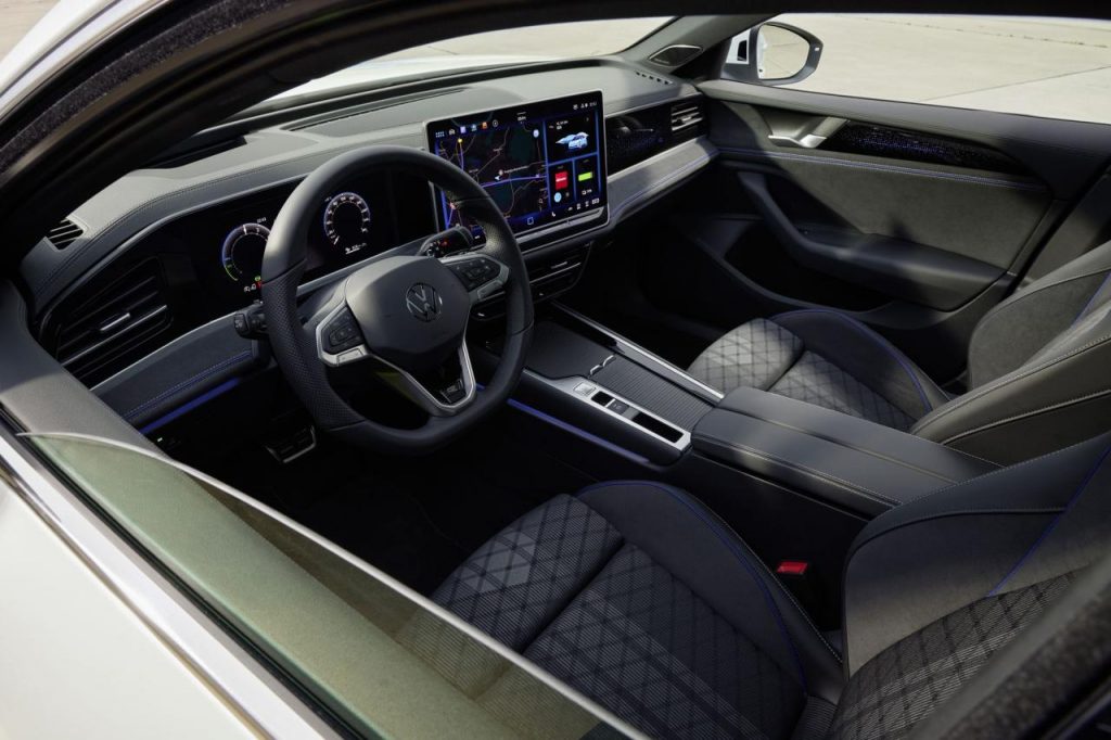 A l'intérieur, la Volkswagen Passat suit les tendances du moment avec une planche de bord horizontale, surmontée par un immense écran tactile "flottant". Les instruments de bord sont affichés via un écran numérique eux aussi. De l'éclairage d'ambiance est ajouté et le sélecteur de vitesses disparait de la console centrale. Très pratique pour dégager de la place et des vide-poches.