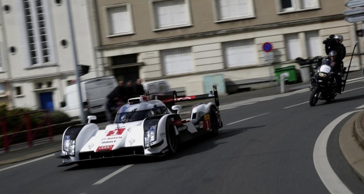 Jusqu’à présent la R18 e-tron Quattro 2014 s’était présentée dans une robe noire minimaliste pour ses diverses apparitions. Changement complet puisque la voiture no1 conduite par Tom Kristensen de la Place des Jacobins jusqu’au circuit il y a quelques minutes est blanche, à parements rouges, gris et noirs. C’est assez réussi, mais il va falloir se concentrer pour ne pas la confondre avec la cousine Porsche 919 sur la piste, blanche elle aussi. Reste à espérer que Toyota n’aura pas la même idée…