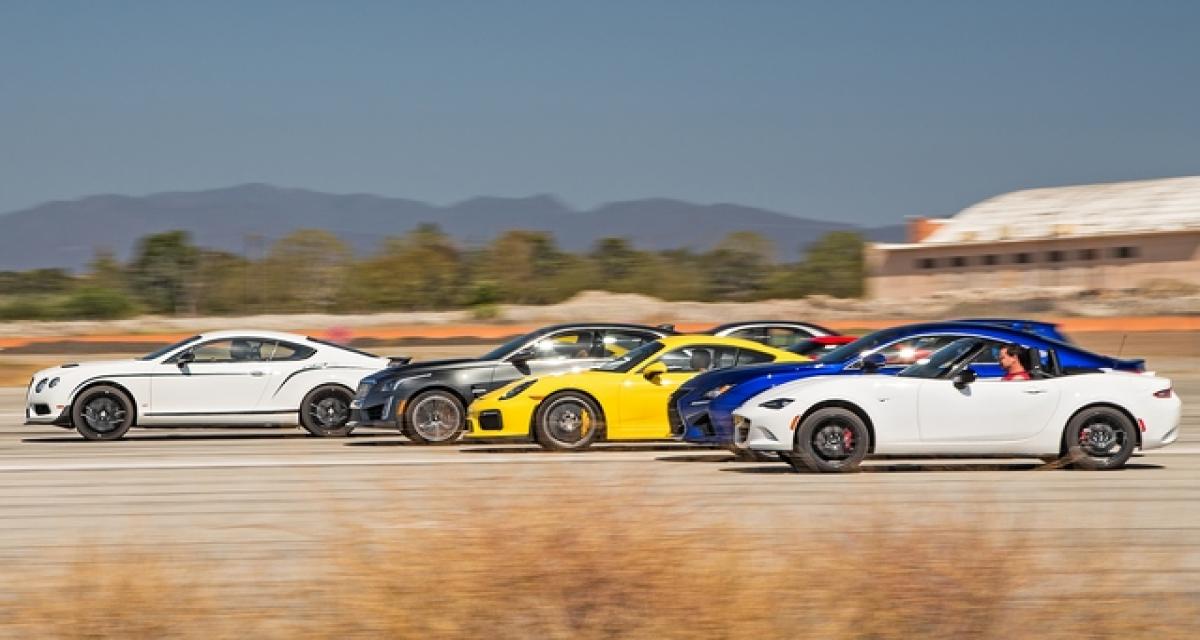 Les dix sportives finalistes en piste ? Une liste assez hétéroclite et des forces en présence à armes inégales : Mercedes-AMG GT S, Bentley Continental GT3-R, Chevrolet Corvette Z06, Cadillac ATS-V, Volkswagen Golf R, Porsche Cayman GT4, Mazda MX-5, Mercedes-AMG C63 S, Lexus RC F, Cadillac CTS-V. Le spectre de puissance est large entre les 160 ch de la Miata et les 659 ch de la Z06. Vous avez dit déséquilibré ? Et on ne parle pas non plus du poids, des roues motrices, etc…