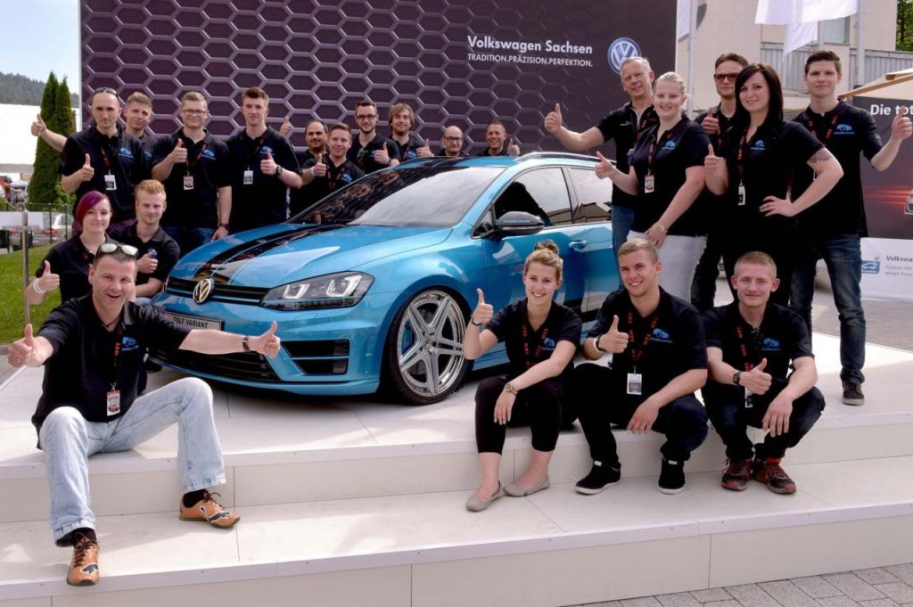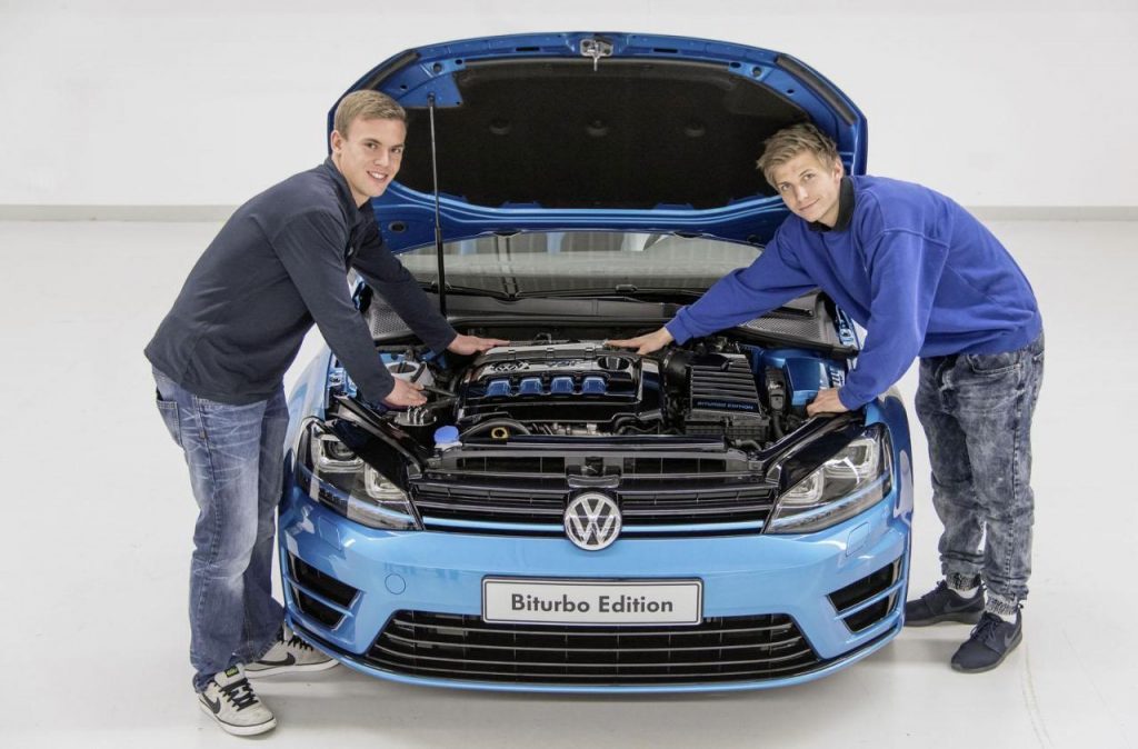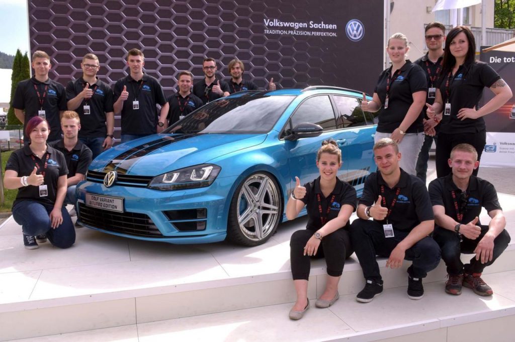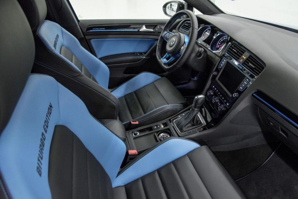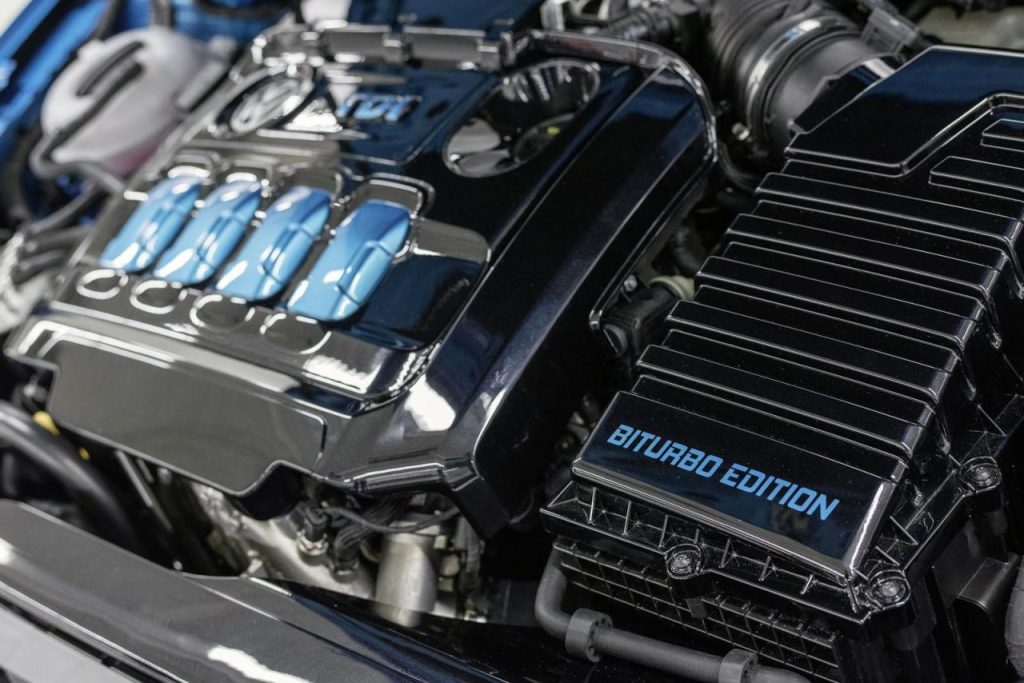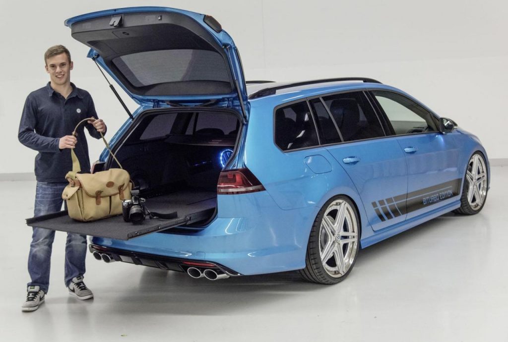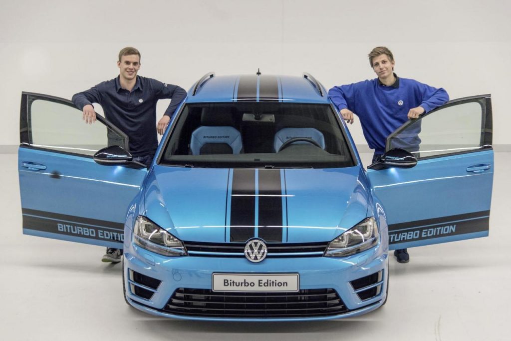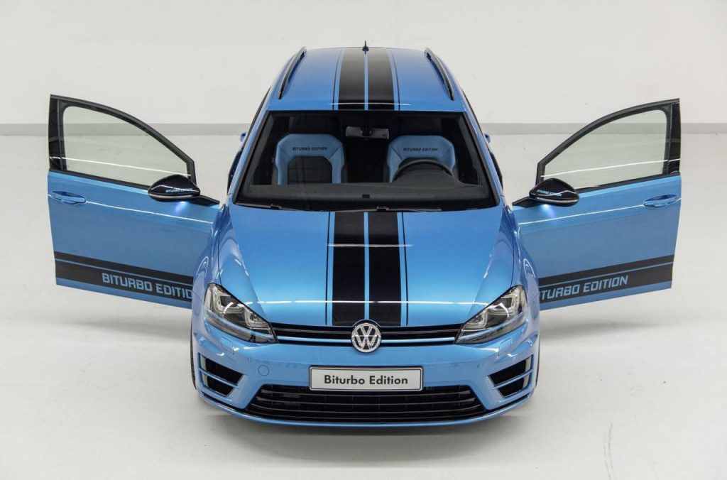 Un cran en-dessous la Golf break R, voici que vient d’être dévoilée la Golf SW Biturbo Edition. Ce modèle réalisé par quatorze apprentis travaillant chez le constructeur ou dans une filiale se distingue par son moteur, partagé avec la Passat, 2.0 l TDI, coiuplé à la boîte DSG, développant 240 ch pour 500 Nm et moins de 6 secondes pour passer de 0 à 100 km/h.
