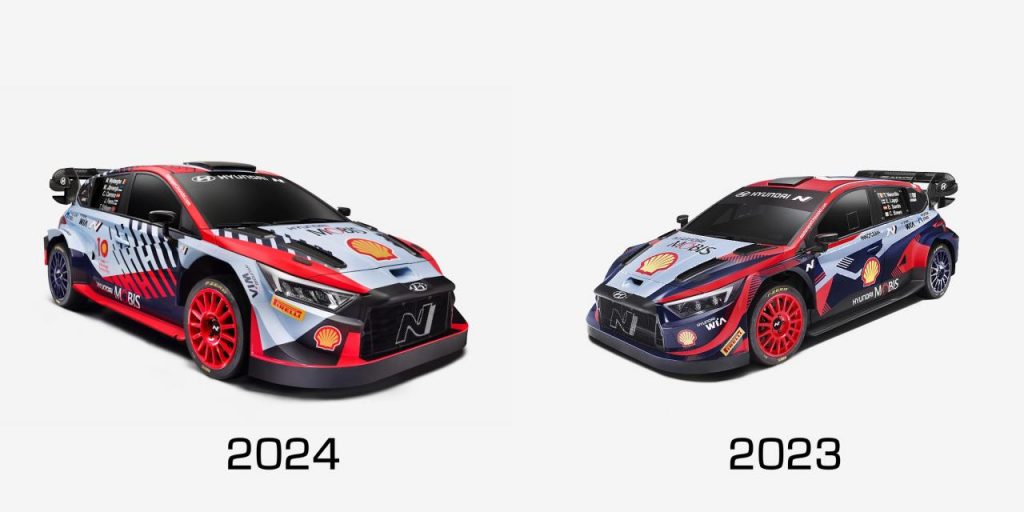 Le bleu foncé de son côté voit sa proportion fortement réduite. Et c'est sans doute tant mieux. Les motifs géométriques changent aussi et affichent des "H" majuscule (comme Hyundai). Pour le reste, ne vous focalisez pas sur les détails. A priori, cette présentation est faite sur une voiture de l'an passé, et des éléments techniques sont "effacés" comme le diffuseur. Pour la comparaison, il y a une image dans la galerie qui présente les deux livrées, 2024 et 2023, face-à-face.