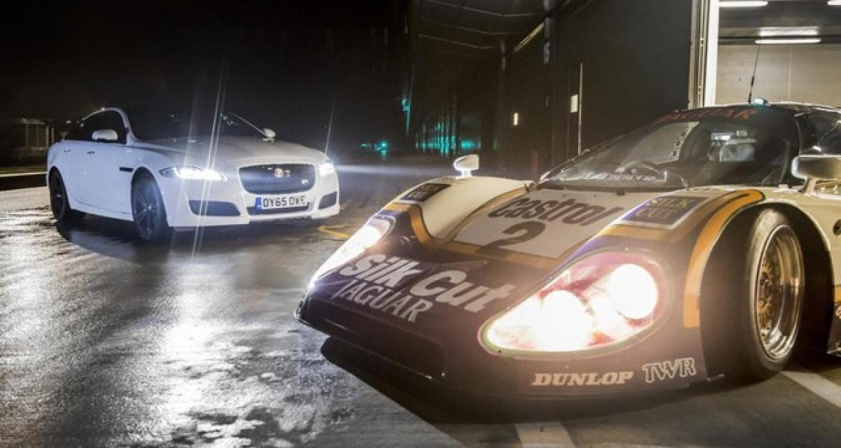 Aujourd’hui, Jaguar cherche à promouvoir les feux à LED en « J » de la XJR. La comparaison avec la XJR-9LM et ses phares qui ne marchent pas est curieuse. A fortiori pour le côté : « Elle a triomphé de la nuit, au Mans. Donc pour sa première sortie de nuit depuis 1988, on a choisi… Silverstone. » Mais au moins, ça change des films avec des SUV et du kite-surf…