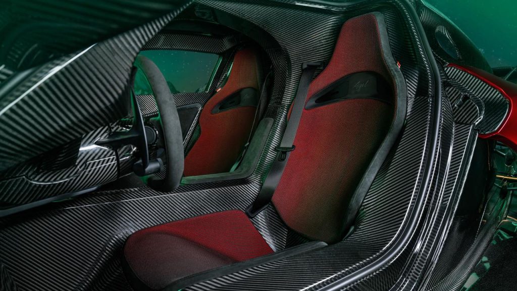 La partie avant est très agressive, faisant penser aux hypercars du Mans. Le regard très acéré repose sur un capot en flèche enchâssé entre des passages de roues type prototype, un habitacle bulle en forme de cokpit, tandis que la partie inférieure sous le capot est une gueule béante laissant place aux prises d’air. L’Agil, taillée pour la piste, dispose d’un kit aérodynamique extrême qui permet de générer 880 kilos de pression à 250 m/h. Tout est pensé pour l’efficacité et l’appui, avec des ouvertures sur les passages de roues et sur les flancs pour le flux d’air – des éléments de suspension sont apparents – alors que la Tur adopte un profil plus épuré et plus élégant, la ligne de toit plongeante se terminant vers une poupe en bec de canard. L’intérieur se veut résolument sportif avec une fibre de carbone brute omniprésente et une console centrale façon « colonne vertébrale » qui sépare en deux cellules le conducteur et le passager, des compteurs ronds mais aussi, sur la Tur, un certain raffinement matérialisé par des sièges, un volant et une console habillés de cuir. L’ensemble fait un peu penser par certains aspects aux intérieurs des Pagani.