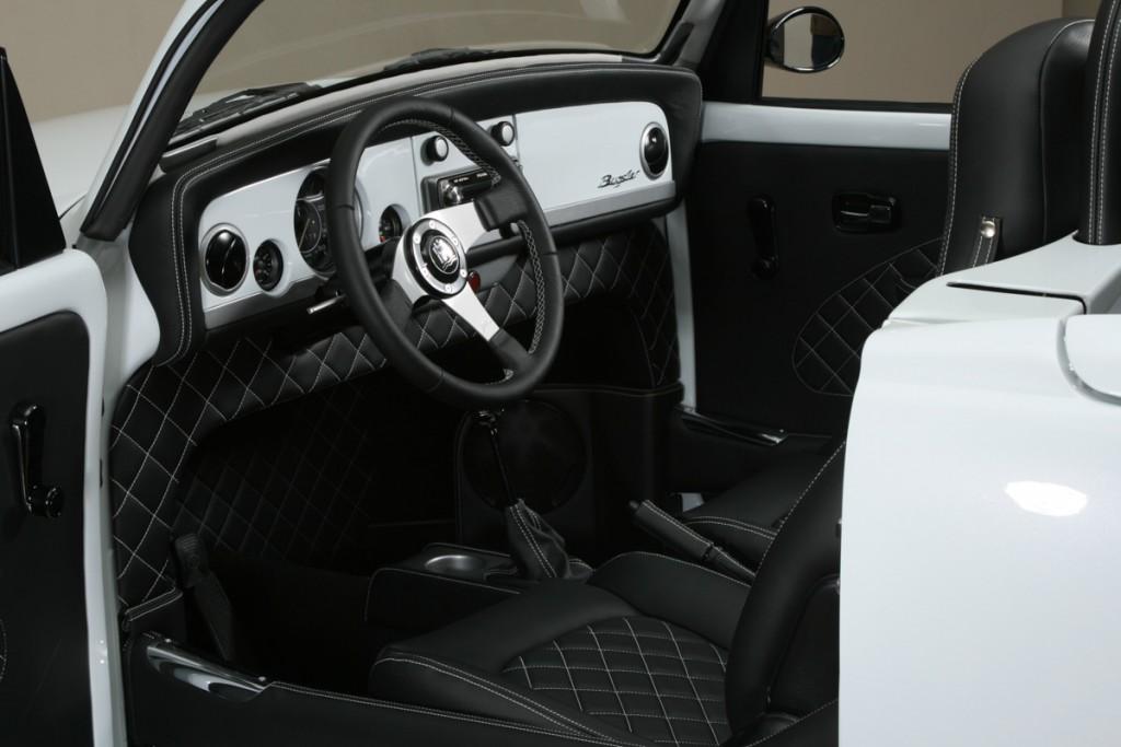 Les différents éléments sont faits en fibre de verre et le tout est supporté par un sous-châssis tubulaire qui supporte le toit et renforce la caisse découpée. Le kit est pour l’instant un modèle unique mais Zovias ambitionne de le mettre en production. Cela vient compléter une préparation complète qui transforme l’intérieur tout en conservant l’identité de la Cox. Cuir noir matelassé surpiqué de blanc, carrosserie blanche, la Zovias va même jusqu’à changer les aérateurs de la Cox.