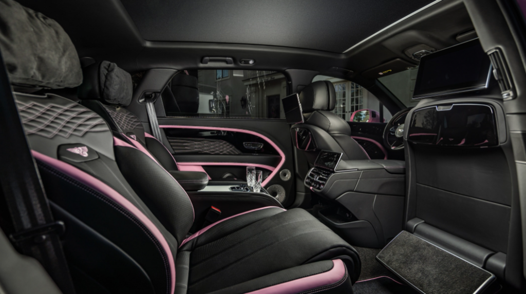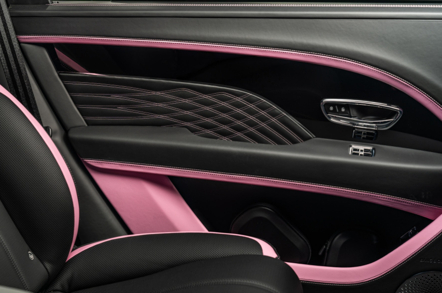 Ce Bentayga EWB Azure Candy Pink marie originalité, « élégance » et technologies de pointe. À l’extérieur, le rose éclatant est contrebalancé par la spécification Blackline : poignées, grilles, sorties d’échappement et barres de toit sont soulignées de noir brillant. Les jantes de 22 pouces peintes et les vitres teintées renforcent encore le contraste saisissant.