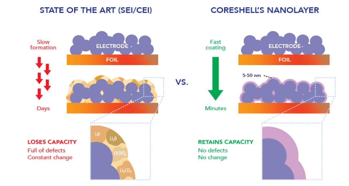 Coreshell a déclaré que son revêtement permet au lithium de passer plus facilement et sans se coincer, ce qui accélère le processus de rodage pendant la fabrication de la batterie, permet d’utiliser moins de lithium et pourrait prolonger la durée de vie de la batterie en protégeant les électrodes.