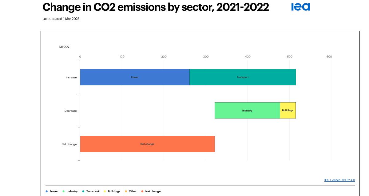 En 2022, les émissions ont été alimentées par un recours accru aux énergies fossiles, phénomène lié notamment à la recrudescence d'épisodes climatiques extrêmes ou aux travaux de maintenance opérés sur très grand nombre de réacteurs nucléaires, tout particulièrement en France.