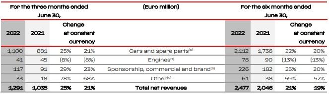 La baisse des revenus de la section Moteurs (41 millions d'euros, en baisse de 8,5%) s’explique principalement par la baisse des livraisons à Maserati, le contrat arrivant à échéance en 2023. L'augmentation des revenus de sponsoring, revenus commerciaux et liés à la marque s'élevant à 117 millions euros (+ 29,5 %) s'explique principalement par le meilleur positionnement dans le championnat de Formule 1 en 2021, Ferrari ayant terminé 3ème du championnat 2021 après la désastreuse 6ème place de la saison 2020.