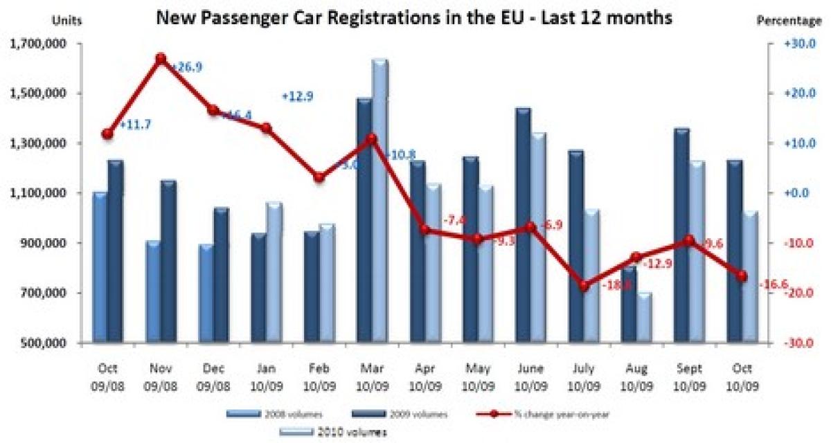 Durant le mois d’octobre, 1.027.036 voitures ont été immatriculées dans l’Union européenne ce qui porte le total des ventes à 11,9 millions d’unités en 2010.