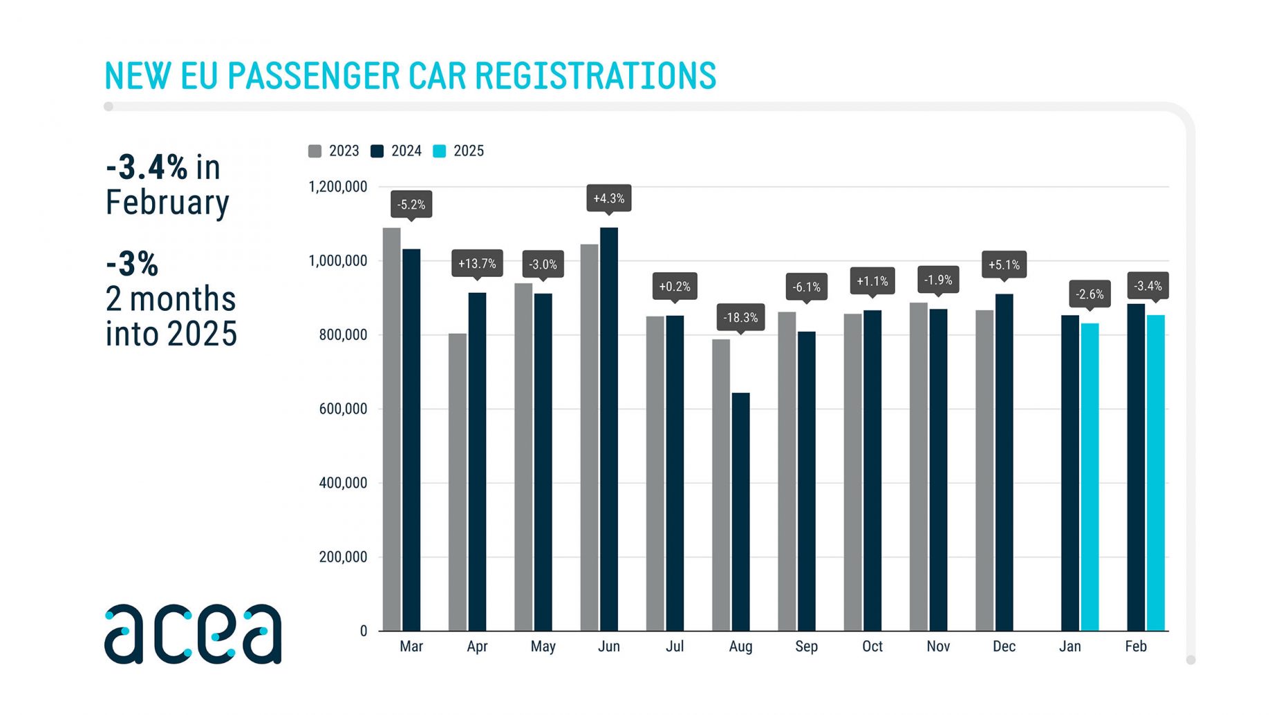 Selon les chiffres de l’ACEA (association des constructeurs européens d’automobiles), le marché automobile européen est en recul de 3,4 % sur le mois de février 2025 par rapport à février 2024. Les ventes de véhicules électriques sont très loin des 25 % fixés avec tout de même une part de marché de 15,2 % depuis le début de l’année 2025.