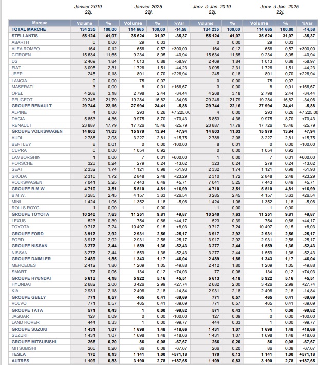 Après un passage à vide en 2024, Renault se rattrape. Le constructeur au losange gagne plus de 3 points de part de marché. La Renault 5 démarre sur les chapeaux de roues et s’installe dans le top 10 des ventes. Pour Dacia qui reste sous les 10000 ventes, la situation est ambivalente. C’est 70% de mieux qu’en 2019…mais c’est 40% de moins que l’an dernier! Le succès du Duster 3 ne compense que partiellement le recul de la Spring.