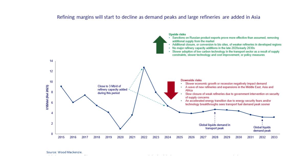 Selon l’analyse du cabinet, les marges de raffinage commenceront à s'affaiblir d'ici la fin de la décennie à mesure que la demande de combustibles fossiles déclinera. Dans les pays de l'OCDE, la demande de carburants pour les transports commencera à diminuer à partir de 2025, tandis que la réduction des quotas gratuits pour les émissions de carbone impactera également les marges nettes de trésorerie européennes à partir de 2030.