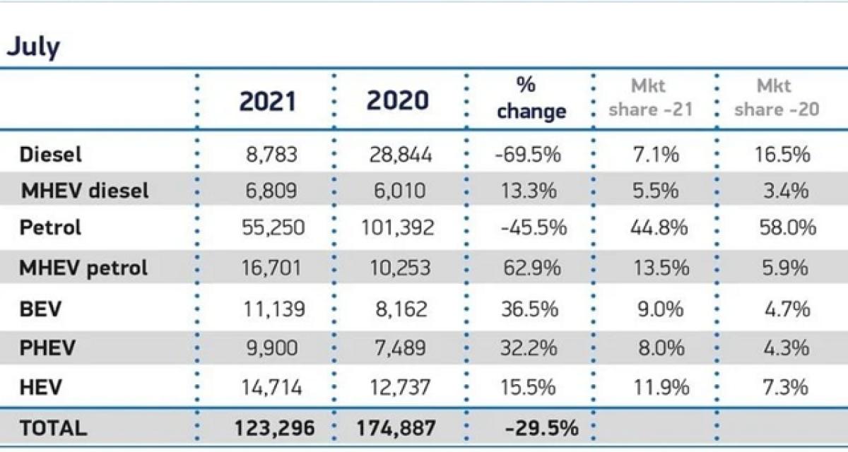 Alors que la demande avait pu être stimulée en juillet 2020, premier mois complet d’ouverture des concessionnaires britanniques après les mesures de confinement, juillet 2021 aura été marqué par une pénurie de semi-conducteurs et l’obligation faite aux personnes atteintes du Covid-19 ou cas contacts à demeurer isolées.
