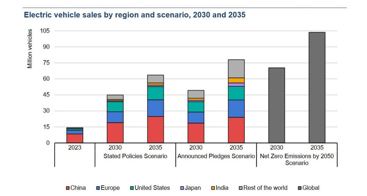 Au premier trimestre 2024, les ventes de véhicules électriques ont progressé de 25% en valeur glissante annuelle, une croissance similaire à celle de l’année 2023. Globalement, selon les prévisions de l’AIE, 2024 devrait encore être une année record avec une augmentation des ventes de voitures électriques de 20%. Plus d’une voiture sur cinq vendue dans le monde serait ainsi électrique, avec environ 17 millions de véhicules écoulés.