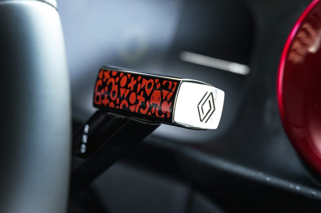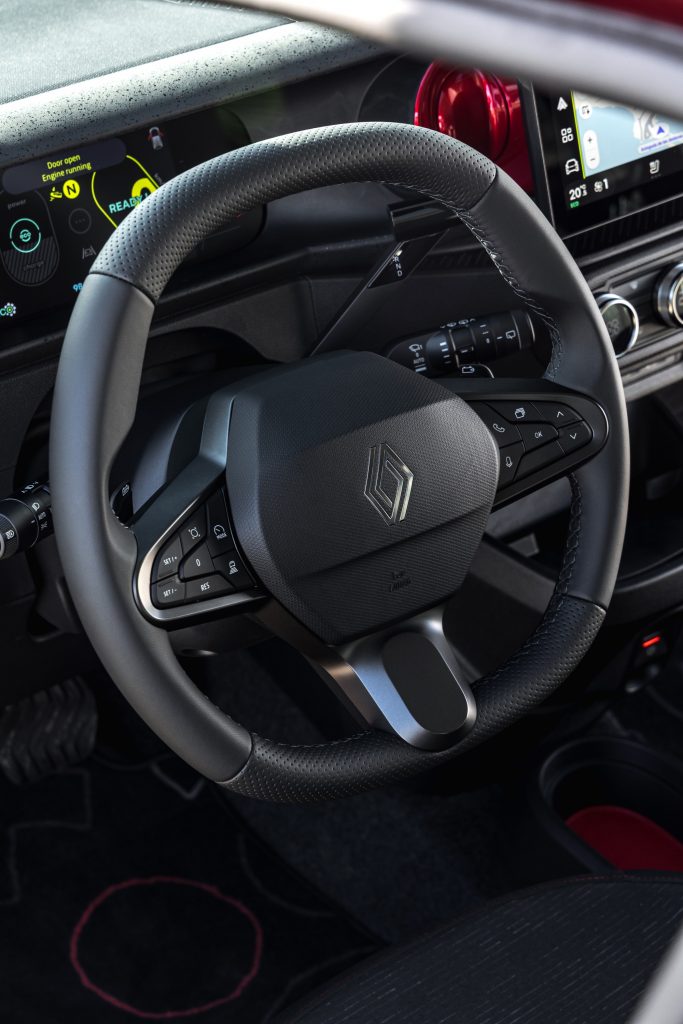 Renault ne pouvait pas non plus se rater à l’intérieur. Pour accompagner ce nouvel objet néo-rétro, il fallait un habitacle à la hauteur, avec ce qu’il faut pour ne pas effrayer la jeune clientèle et les coups d’œil à l’ancienne pour charmer les plus nostalgiques. La planche de bord reprend beaucoup d’éléments connus sur les Renault d’aujourd’hui, notamment en termes d’équipements. Le volant a été repris de modèles existants, comme la plupart des commandes. Il fallait bien sûr un grand écran tactile et connecté pour pouvoir brancher en CarPlay ou Android Auto son smartphone. La couleur pop se retrouve sur une bonne partie de la planche de bord.