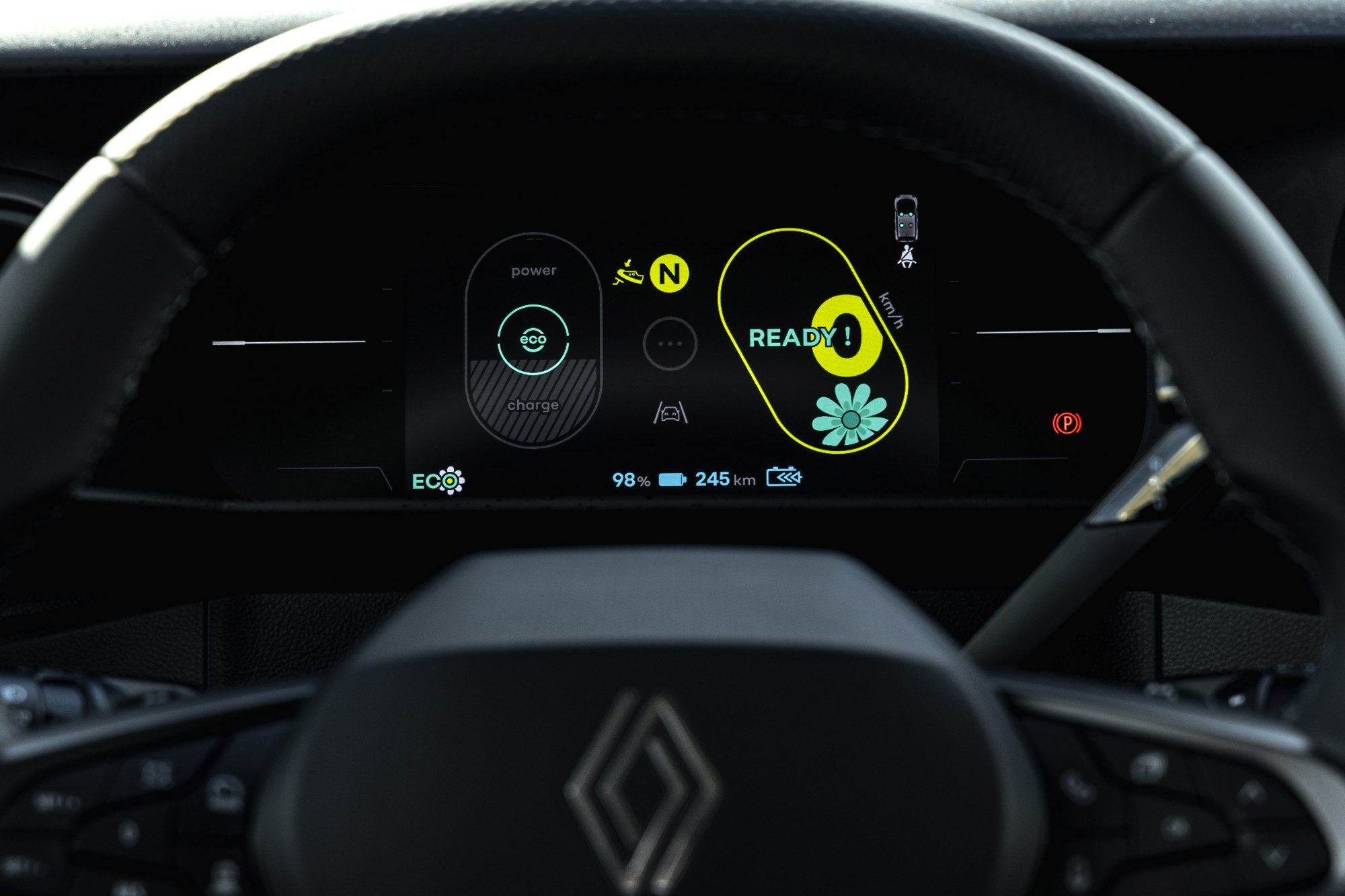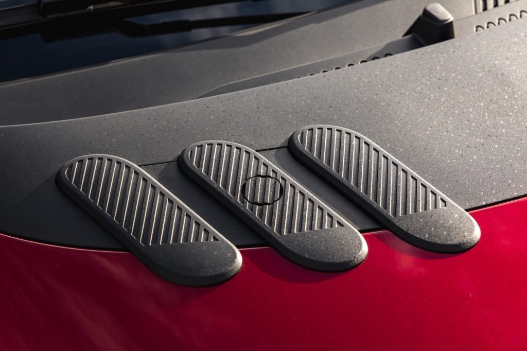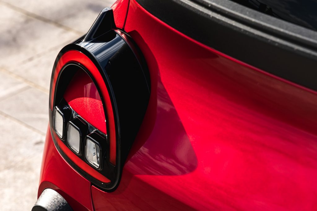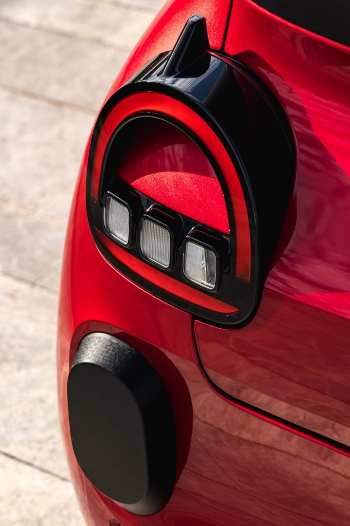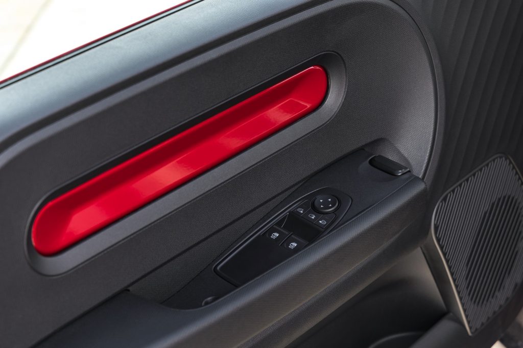 Mais elle s’éloigne du modèle d’origine à bien des égards, et pour le meilleur. La Twingo E-Tech a droit à 5 portes, ce qui facilite notamment très largement l’accès, on y reviendra. Ses couleurs pop vont très bien à cet objet de design hyper moderne. Et puis les détails. Il y a bien sûr l’écriture de « Twingo », qui ne sont pas vraiment des lettres, mais un alphabet de formes, que l’on retrouve ici et là. Il y a aussi les petites ailettes sur les feux arrière, comme deux cornes de diable, qui, selon Renault, à elles seules comptent pour 5 kilomètres d’autonomie supplémentaires. Il y a bien entendu l’effet de fraîcheur, mais la voiture fait nettement tourner les têtes.