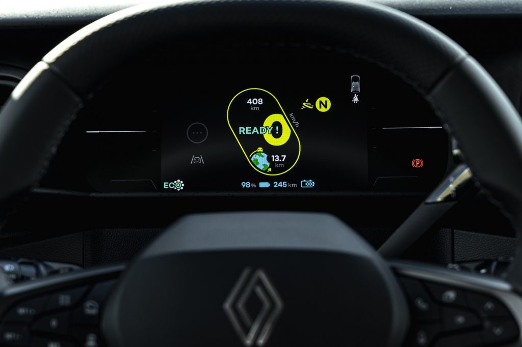 Côté motorisation, on ne s’attendait pas à ce que Renault mette la cavalerie de ses grandes sœurs R5 ou R4. Ici, on se contente d’un moteur de 82 chevaux, au couple maxi de 175 Nm. Son office suffit largement pour pouvoir apprécier le quotidien en douceur, sans bousculer ses passagers avec des démarrages canon pas toujours très agréables au final, surtout en ville où l’on a besoin aussi d’une certaine fluidité d’action. Pour une raison qu’on ignore, Renault refuse de communiquer sur son 0 à 100 km/h et évoque un chrono de 0 à 50 km/h. À noter d’ailleurs qu’elle atteint aisément sa vitesse maxi de 130 km/h. Elle n’a pas la nervosité d’une R5, mais n’a rien d’un veau non plus.