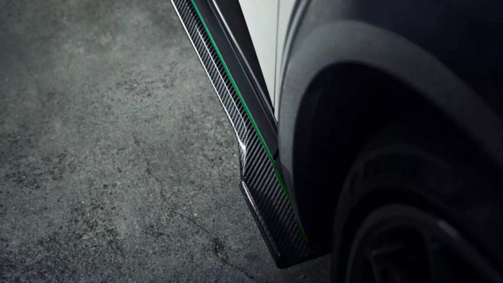 Le modèle d’exposition est peint en blanc mat, complété par des touches de noir brillant et de subtils reflets verts. Les badges « DK Edition » emblématiques ornent les montants C et le hayon, mais ce sont les jantes forgées de 21 pouces qui se démarquent le plus. Ces jantes légères réduisent le poids non suspendu de 10,6 kg, ce qui confère au véhicule électrique un avantage en termes de maniabilité.