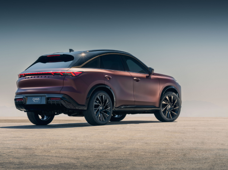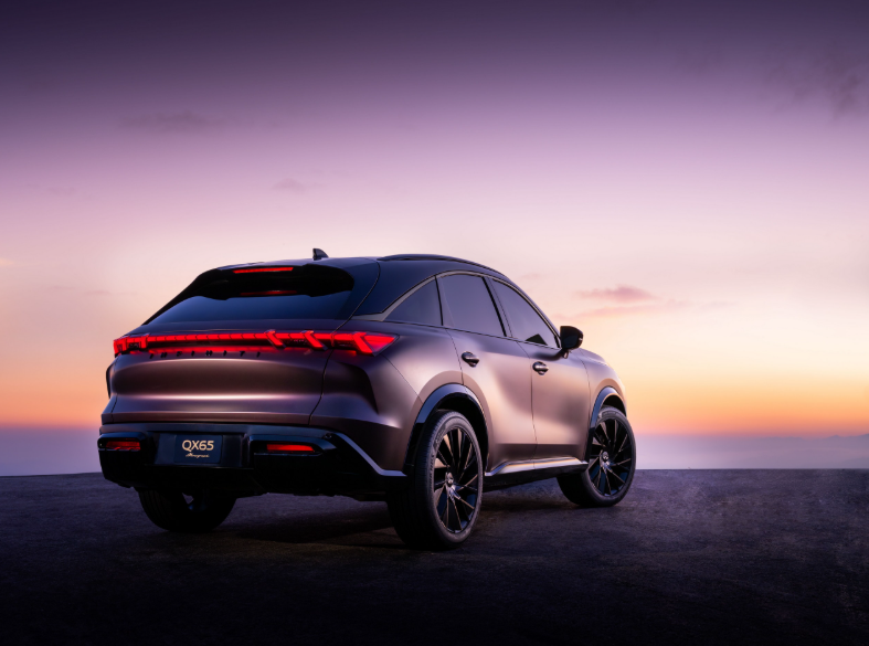 Le QX65 Monograph ne se contente pas d’une silhouette élégante, il multiplie les détails de design sophistiqués. Une fine “lance” sculptée longe la ligne de toit fastback, soulignant son mouvement fluide. Les jantes de 22 pouces reprennent ce thème avec des rayons torsadés et entrelacés, évoquant vitesse et dynamisme.