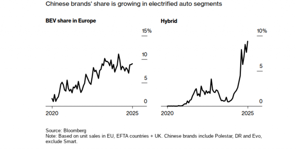 Les constructeurs chinois atteignent des parts record du marché des hybrides et véhicules électriques en Europe, malgré les tarifs de l’UE.