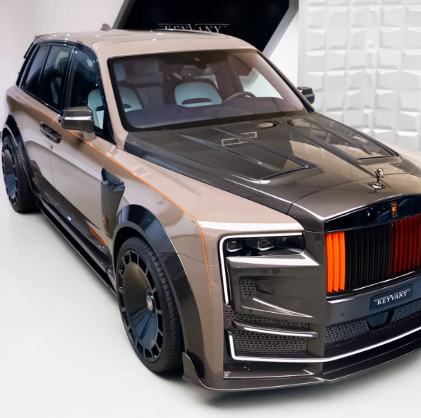 Les traditionnels logos Rolls-Royce sont remplacés par des badges « K » orange et noir, que l’on retrouve sur toutes les faces du véhicule, signant clairement l’œuvre de Keyvany et rompant totalement avec l’élégance discrète habituelle de la marque britannique.