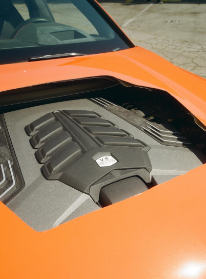 Le capot transparent offre une vue imprenable sur le moteur, tandis que les fusées de pare-chocs en métal brut, les sorties d’échappement massives et les jantes en alliage orange sur mesure soulignent un design radicalement hors normes. L’extérieur orange vif contraste avec l’intérieur noir aux coutures rouges