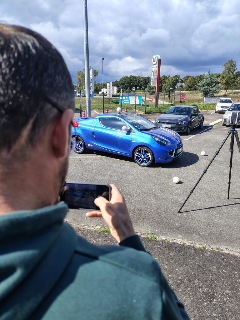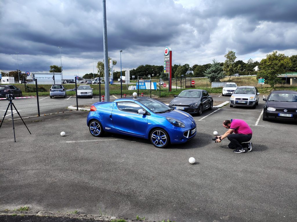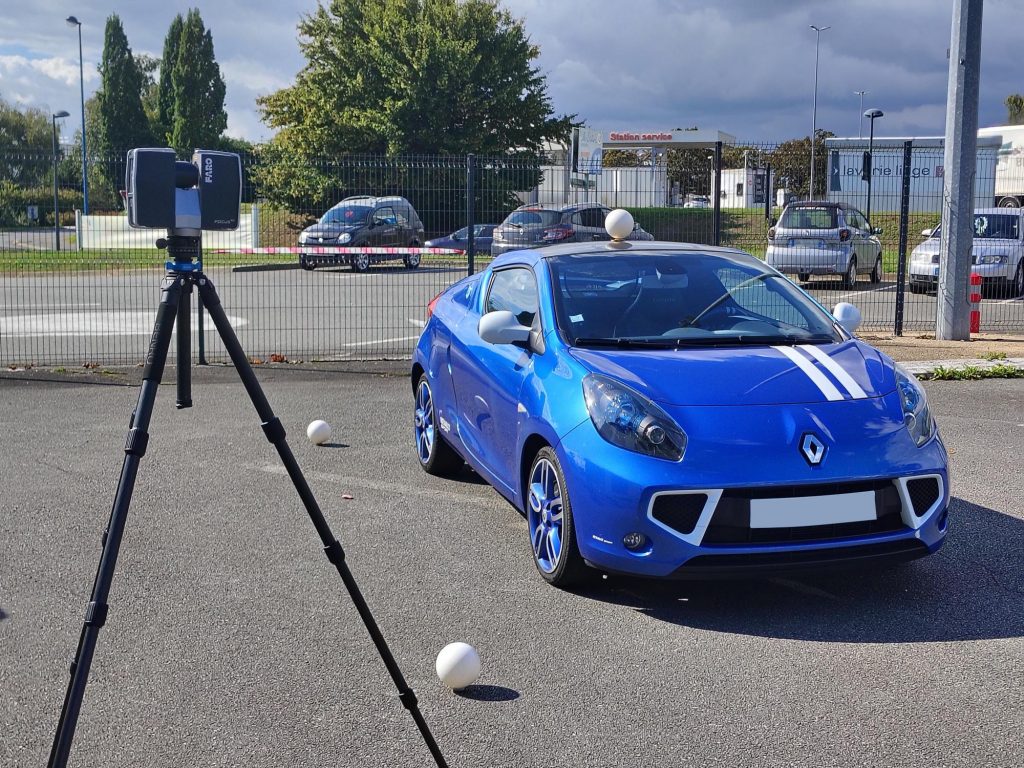 Arnaud place son scanner à plusieurs endroits autour de la voiture : devant, trois-quarts avant, trois-quarts arrière et obtient ainsi 5 à 6 fichiers de « points ». Mais ce n’est pas tout. Il réalise également entre 250 et plus de 1 000 clichés avec un mètre ruban. Le but est d’obtenir tout un tas de cotes comme l’emplacement des moteurs de balais d’essuie-glace, la taille des balais, la taille des écussons, de la trappe à essence, etc. Tout ce qui peut aider ses collègues de la modélisation 3D à reproduire le plus fidèlement possible le véhicule. Ici, environ 300 clichés ont été pris pour le Wind.