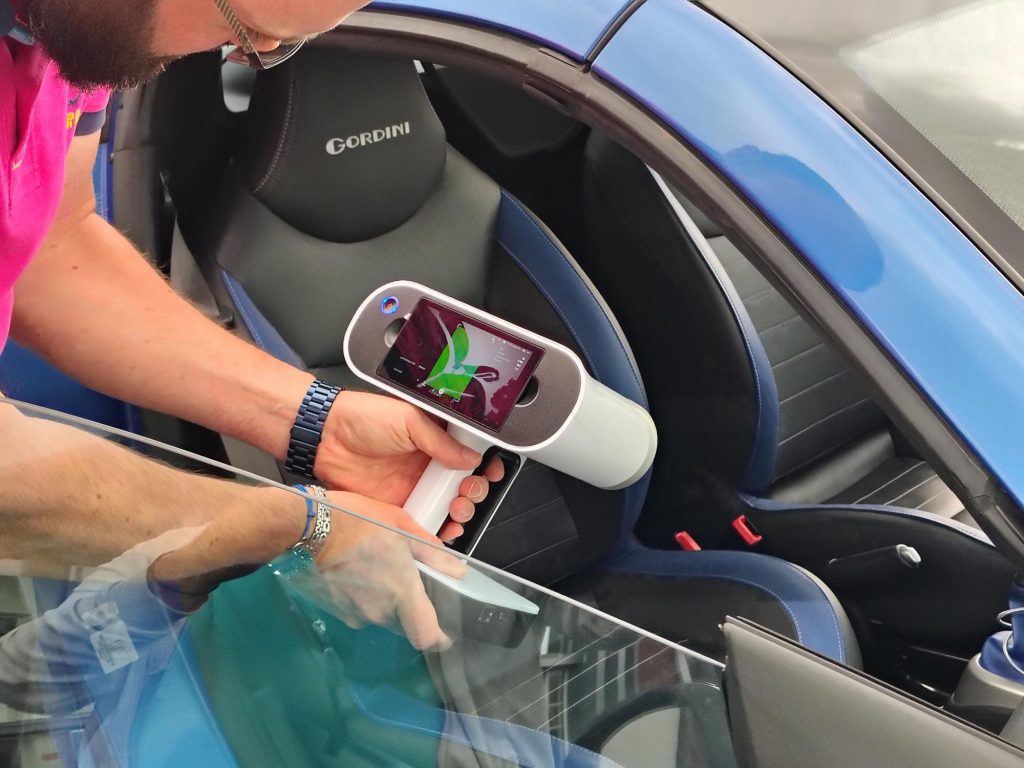 Et pour l’intérieur nous direz-vous ? Eh bien Arnaud utilise un deuxième scanner, à main celui-ci. Il utilise la lumière pulsée. Cela fait un peu ambiance stroboscope et le résultat est visible directement sur l’appareil. Il faut balader le scanner dans tout l’habitacle et y joindre là encore des dizaines de clichés pour aider les collègues.
